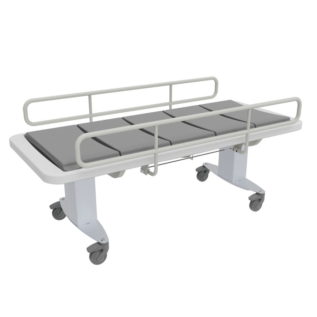 Particulièrement maniable, le chariot de douche permet le transport du patient depuis son lit jusqu’à la salle de bain, directement d’une pièce à l’autre ou au travers de couloirs.