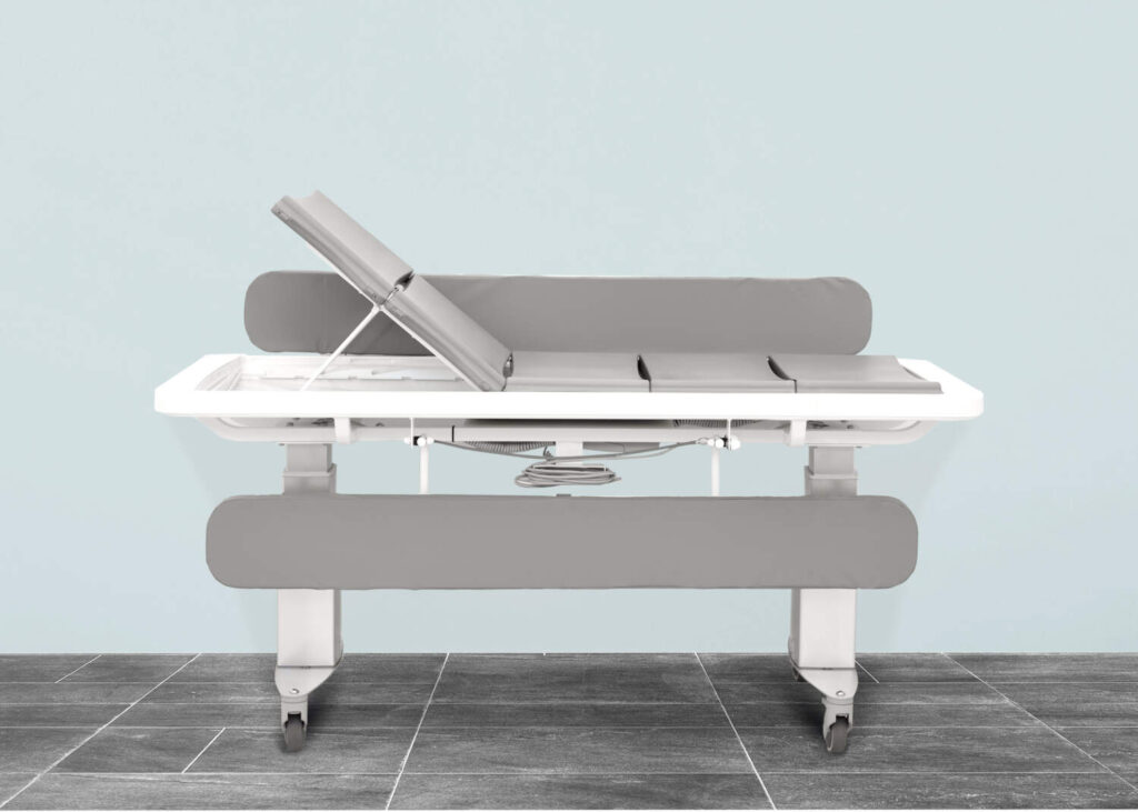 Doté d’un matelas spécifique, ce chariot de douche permet de laver le patient et de lui prodiguer certains soins de balnéothérapie en position allongée.